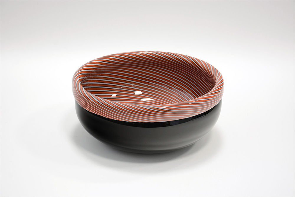 Centrotavola in vetro soffiato ametista scuro e a canne ritorte lattimo ametista scuro e arancione. Murano 1982. Firmato e datato a punta sotto la base (d cm 28,4)