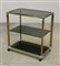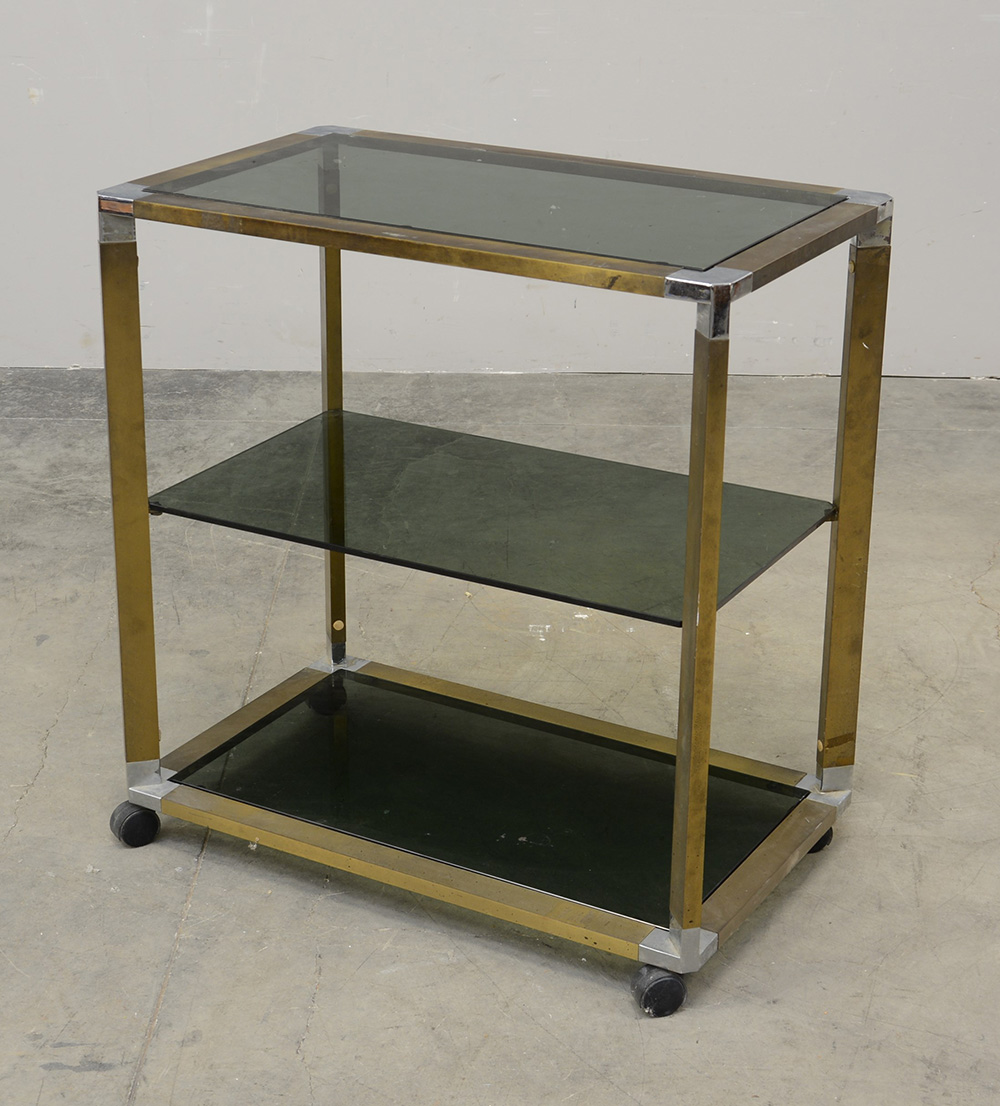 Carrello portavivande a tre ripiani in ottone e metallo cromato con ripiani in vetro fumè. Italia, anni 70 (cm 75x78x44)