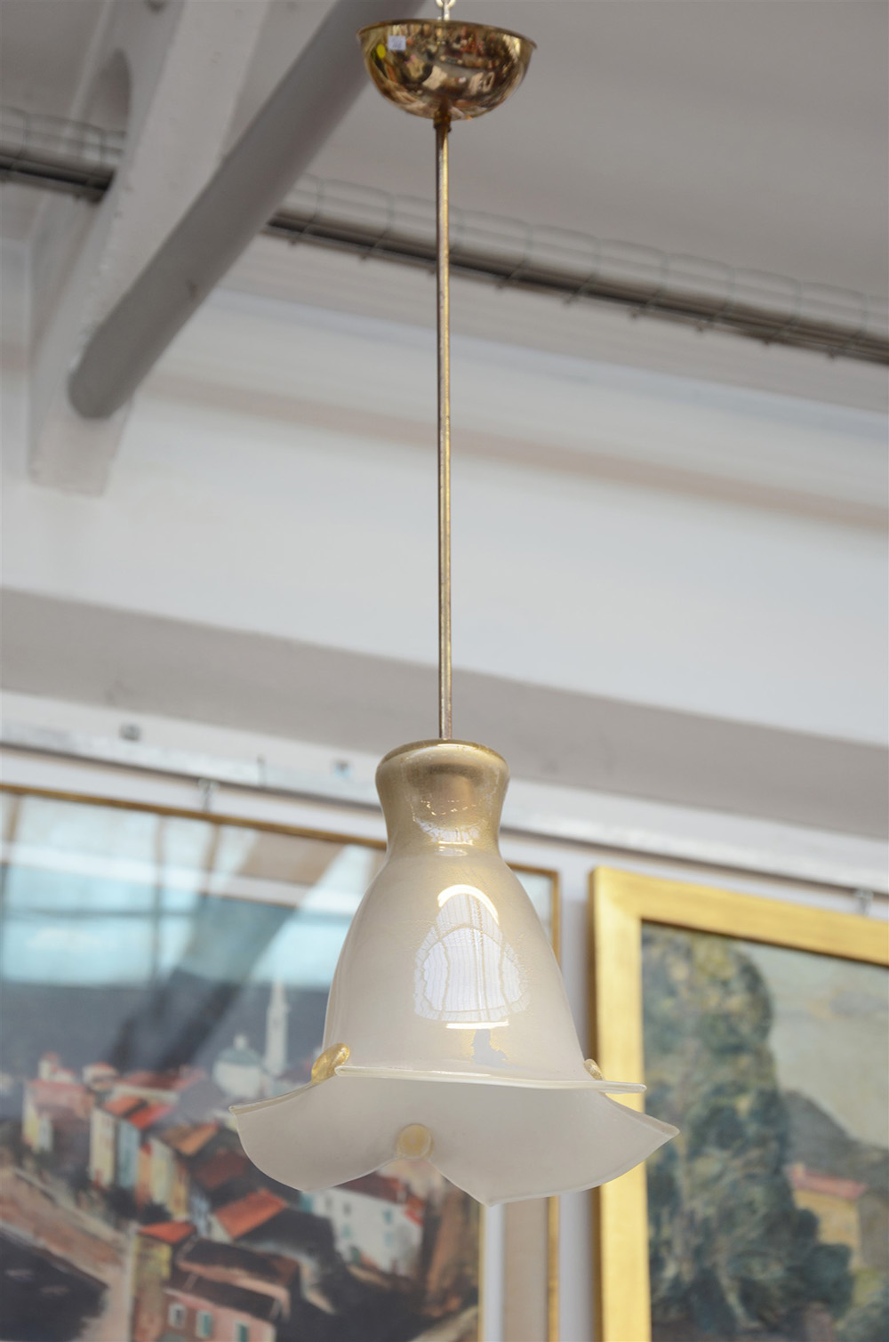 Lampada da sospensione con paralume in vetro soffiato con applicazione di foglia d'oro e acidata sulla superficie interna. Murano, anni 70 (h cm 90) (lievi difetti)