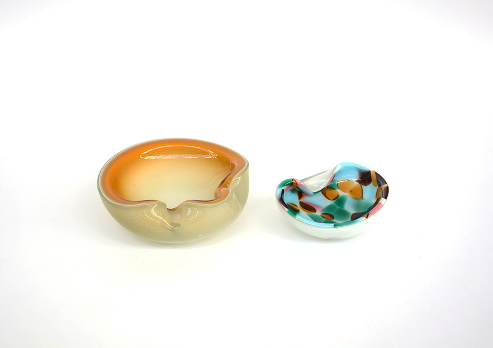 Manifattura di Murano. Lotto di due posacenere in vetro incamiciato di diversi colori. Anni 60 (d cm 10; l cm 15)