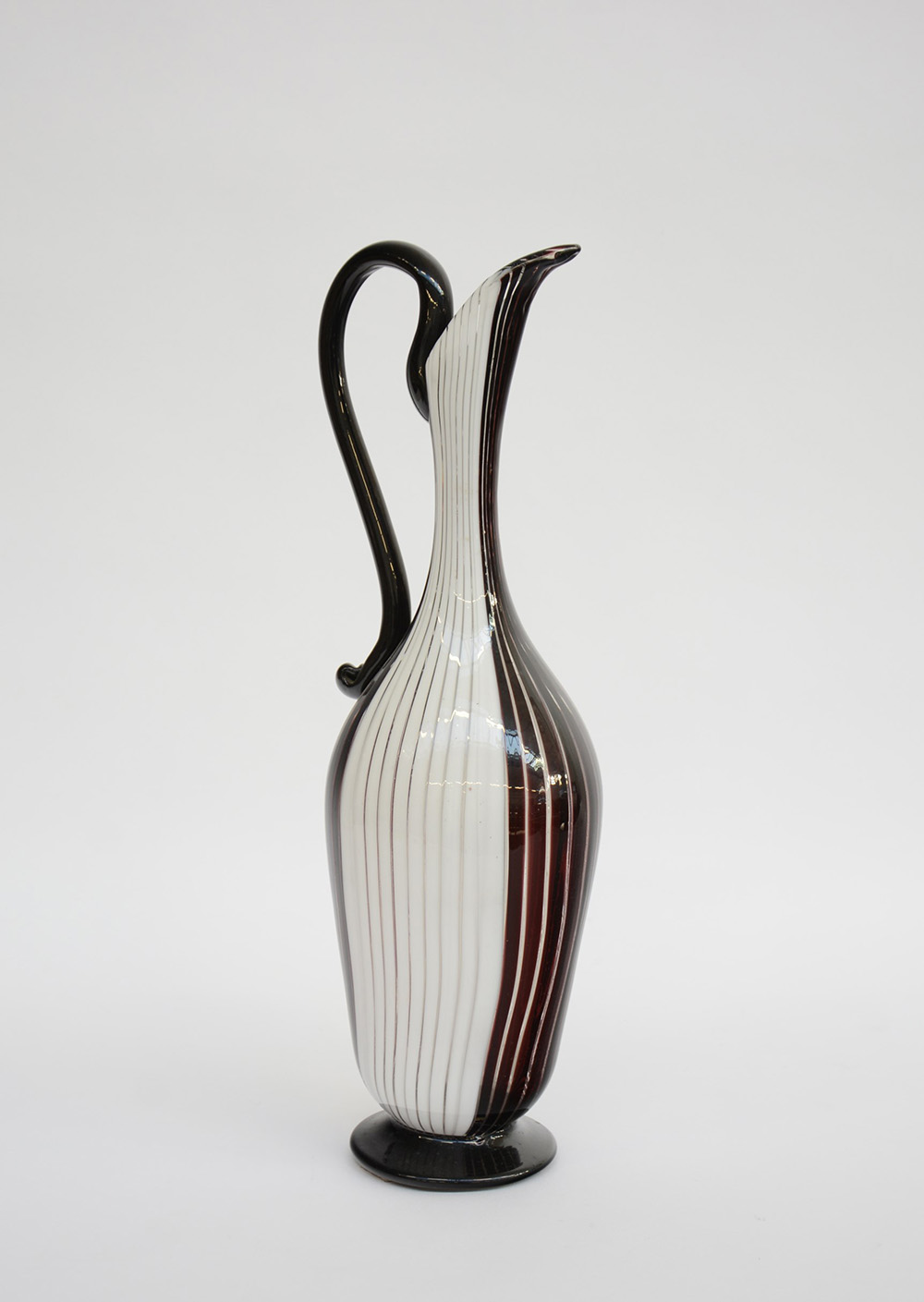 Manifattura di Murano. Versatoio in vetro soffiato e canne incolre, lattimo e ametista. Anni 60 (h cm 44)