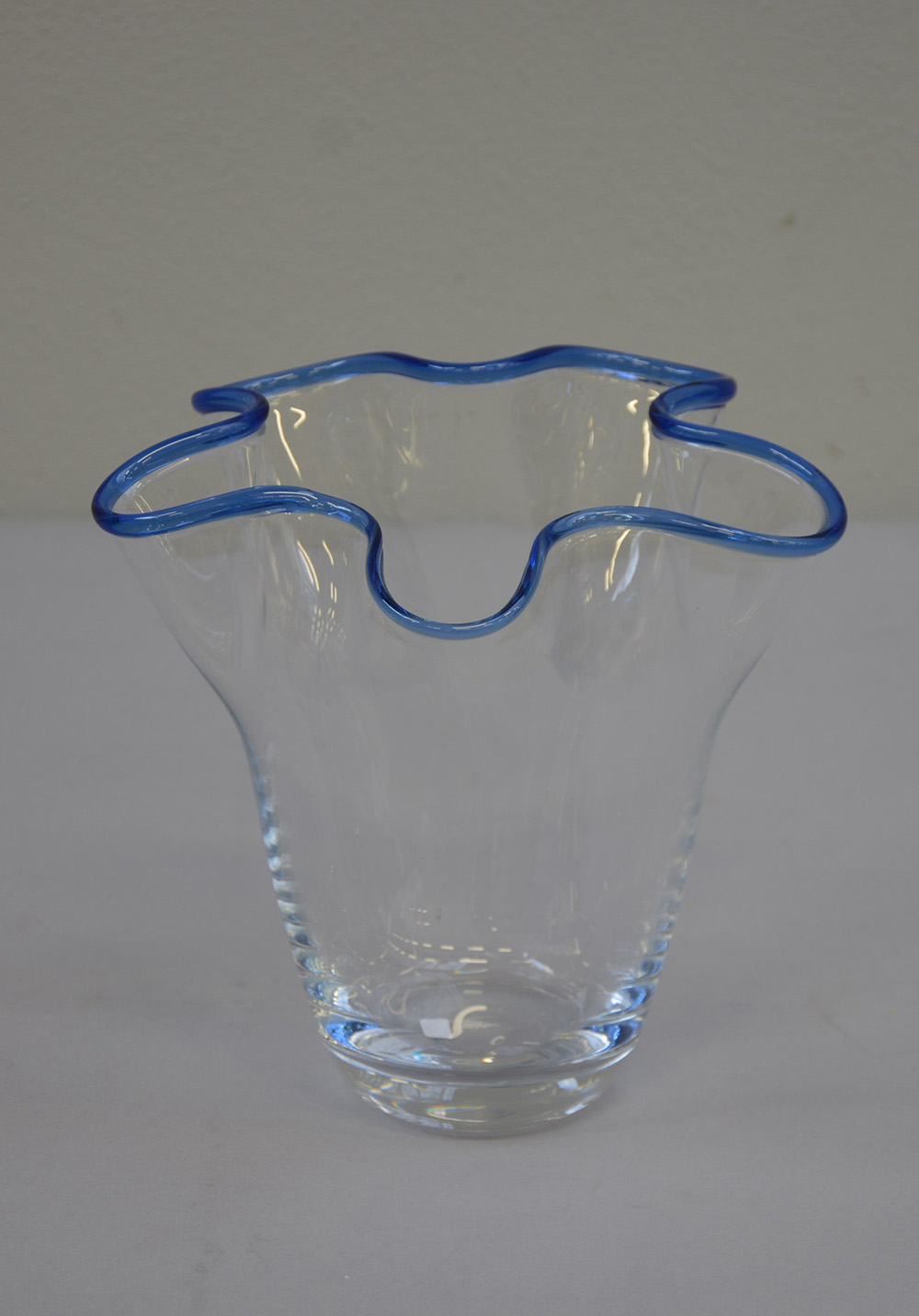 Vaso a fazzoletto in vetro soffiato incolore con orlo applicato a caldo in vetro trasparente azzurro. Produzione recente (h cm 23)