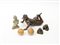 Manifattura di Cina. Lotto composto da tre sculture in bronzo, una in terracotta e due sfere scacciapensieri in legno (difetti e mancanze)