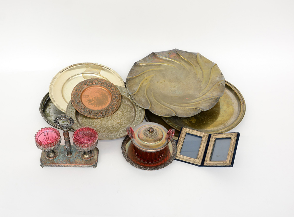 Cartone contenente una saliera e una formaggera in metallo con vetro rosa, numerosi vassoi in metallo e due cornicette portafoto a libro in argento (difetti)