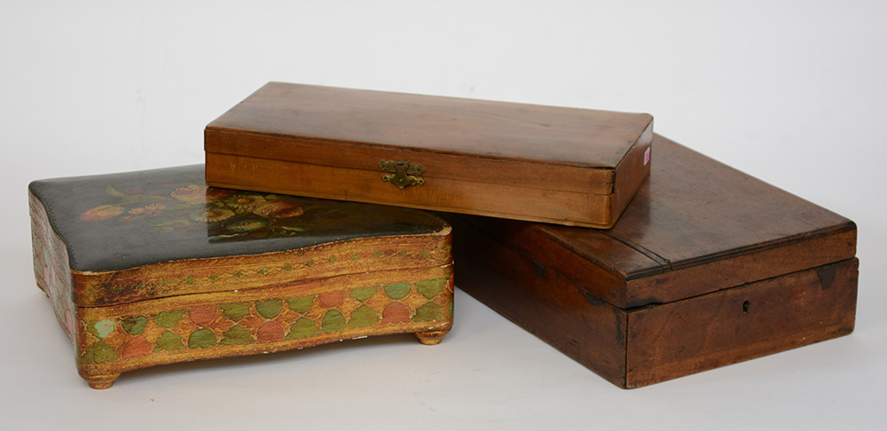 Gruppo di tre scatole in legno di cui una con coperchio dipinto a fiori (difetti)