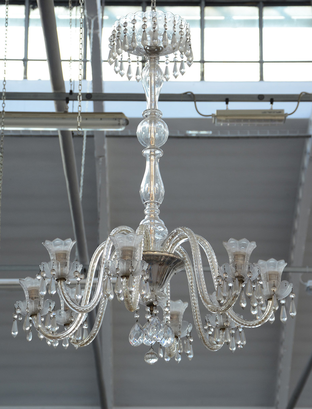 Manifattura di Boemia. Lampadario a otto fiamme con pendagli in vetro (h cm 110)