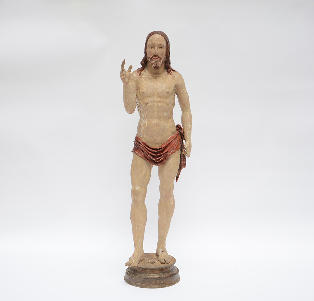 Arte del sec. XVII "Cristo benedicente" scultura in legno intagliato e laccato poggiante su base tonda (h cm 80) (difetti, restauri e mancanze)