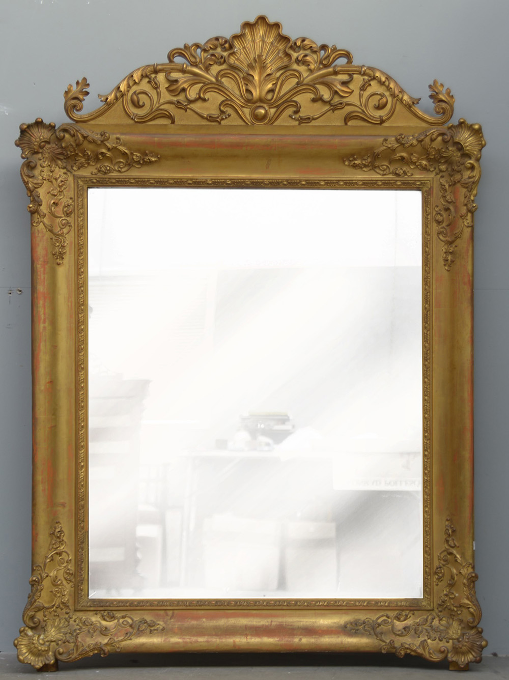 Specchio con cimasa non coeva in legno e pastiglia dorata decorata a motivi vegetali e fiori. Sec. XIX (cm 170x122) (difetti e restauri)