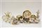 Lotto composto da un gruppo in porcellana policromia raffigurante concertino, una scultura in porcellana bianca e oro raffigurante ragazzo con cagnolino, e alcune tazze e piattini di manifatture e decori diversi (difetti)