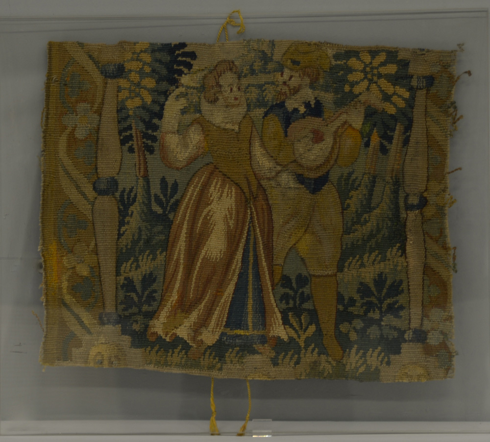 Frammento di arazzo tessuto in lana e seta raffigurante scena galante, Fiandre, secolo XVIII. Contenuto tra due lastre in plexiglass (cm 36x47) (difetti e mancanze)
