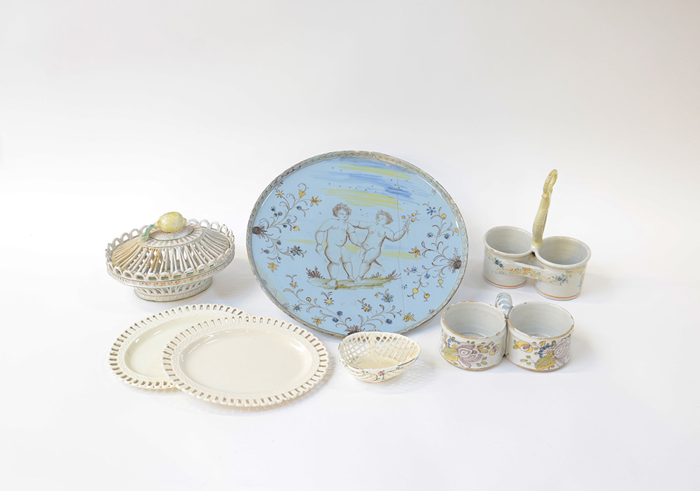 Lotto di maioliche composto da un'alzata, due vassoietti, due porta condimenti e un centrotavola con coperchio. Manifatture, epoche e misure differenti (difetti, restauri e mancanze)