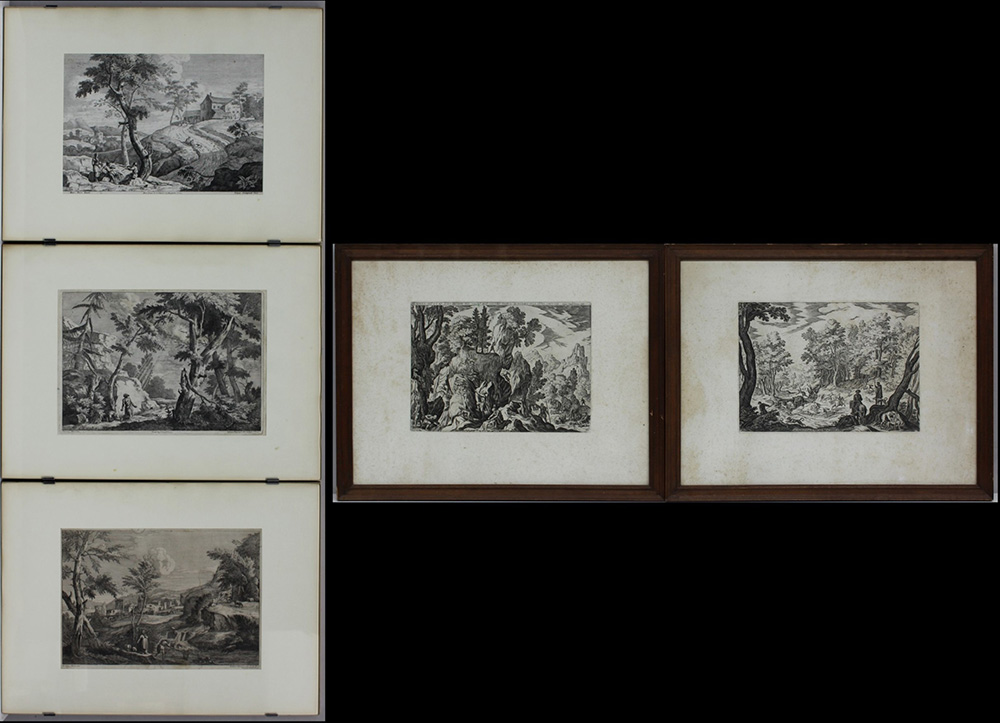 Lotto composto da cinque incisioni raffiguranti scene campestri di gusto tardo settecentesco, di diverse dimensioni (lievi fioriture). Misure diverse in cornici non omogenee (lievi difetti).