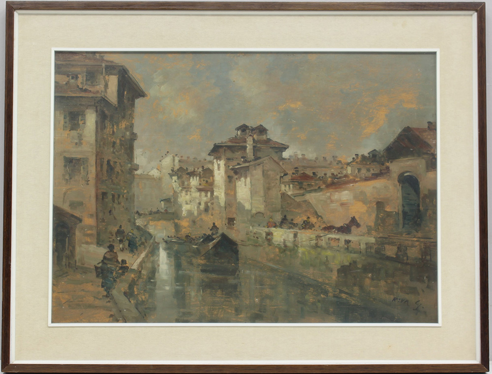 G. Riva "Milano scomparsa, via Conca del Naviglio Largo Cesare Correnti" olio...