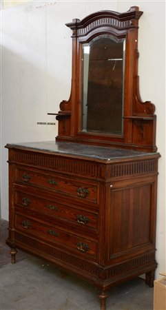 Comò in legno dolce a tre cassetti grandi e uno piccolo sottopiano decorato da scanalature, piano in marmo grigio e alzata con specchiera. Prima metà sec. XX (cm 120x210x58) (difetti)