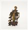 Scultura in occhio di tigre raffigurante dama dalle lunghe vesti con base in legno (difetti e mancanze)
