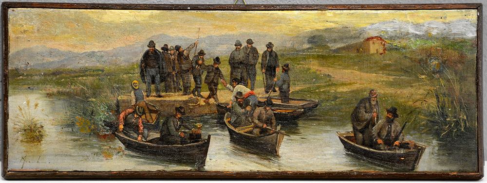 Firma indecifrata, “L’imbarco”, olio su tavola (cm 13x37) firmato in basso a sinistra; in cornice (lievi difetti)