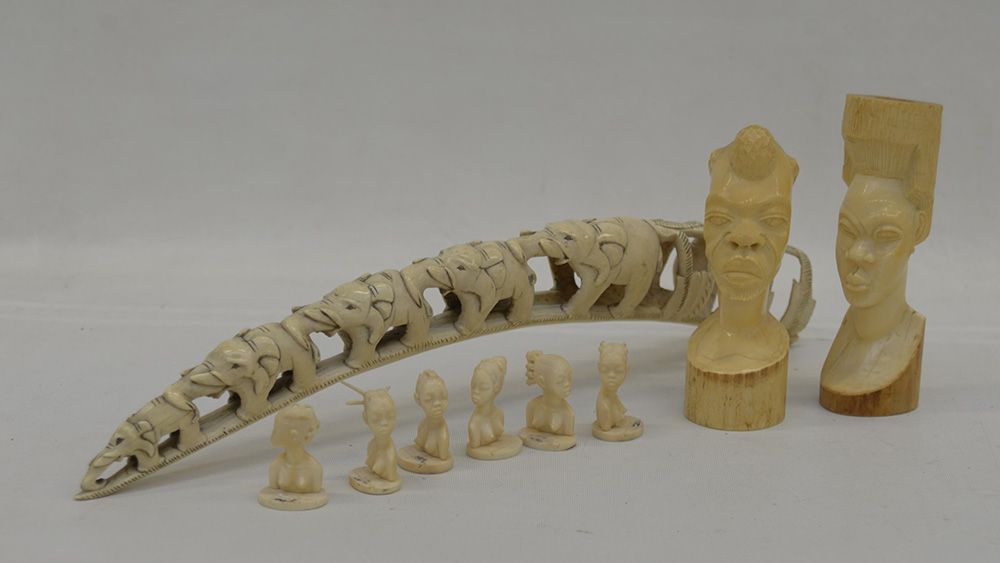Arte etnica, lotto composto una zanna intagliata con processione di elefanti, e due sculture raffiguranti volti in osso unite a sei sculturine raffiguranti volti femminili di altro materiale.
