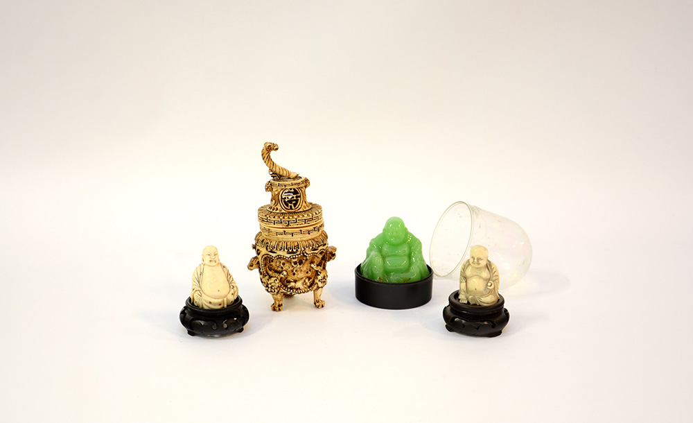 Lotto composto da una coppia di Budai in avorio su basi in legno e uno in pietra dura, cui si unisce un incensiere tripode con coperchio in avorio