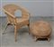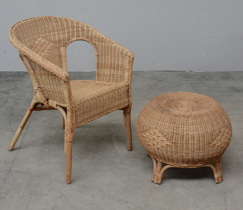 Lotto composto da una poltrona ed un poggiapiedi in midollino intrecciato