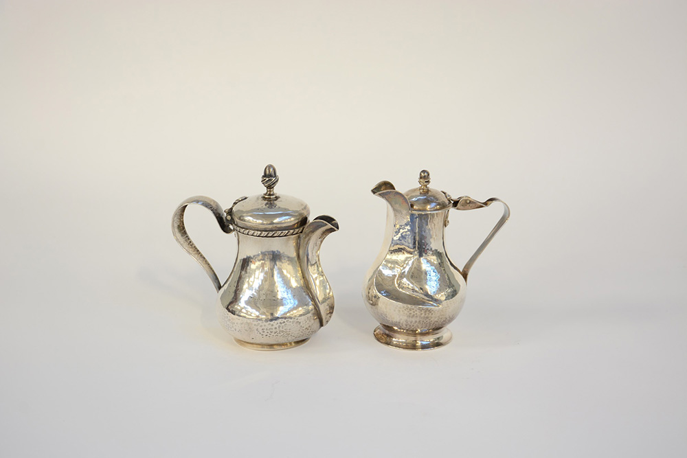 Lotto di due cuccume in argento con corpo martellè. Italia, sec. XX (h. max cm 14,5) (gr 540 ca.) (lievi difetti)