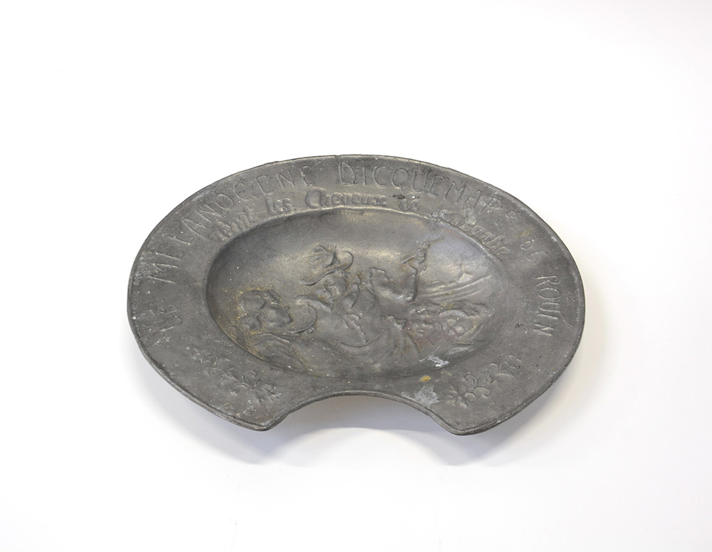Antica barbiera in peltro, con scena d'osteria in rilievo nel cavetto (cm 35x25) (difetti)