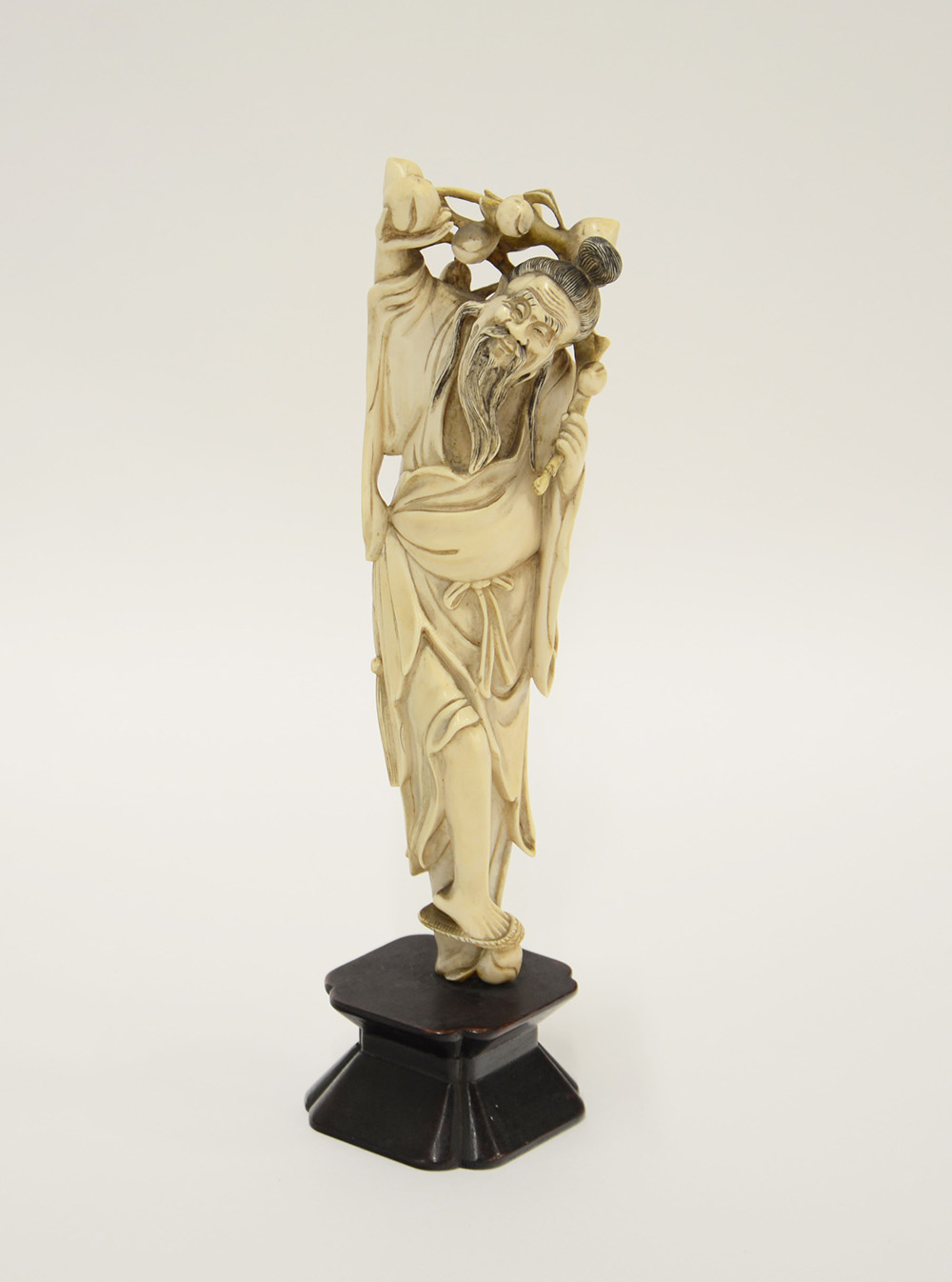Saggio dalla lunga barba con ramo di pesche sulle spalle, in avorio con base in legno (difetti)