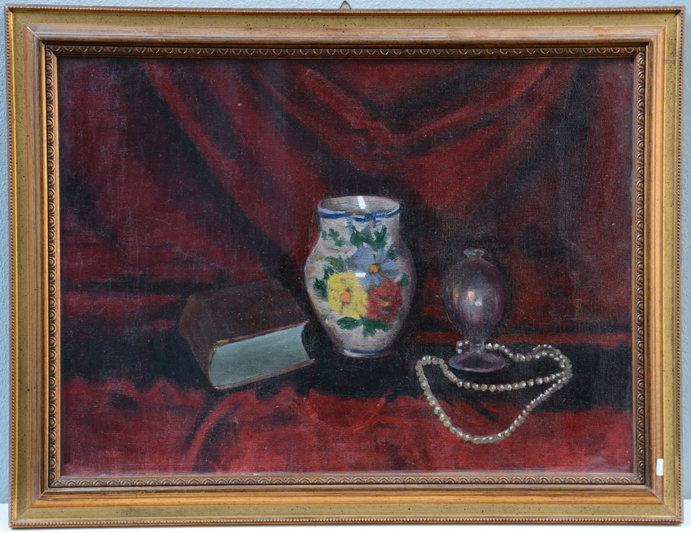 Ignoto "Natura morta con vaso e collana di perle" olio su cartone telato (cm 40x55) in cornice