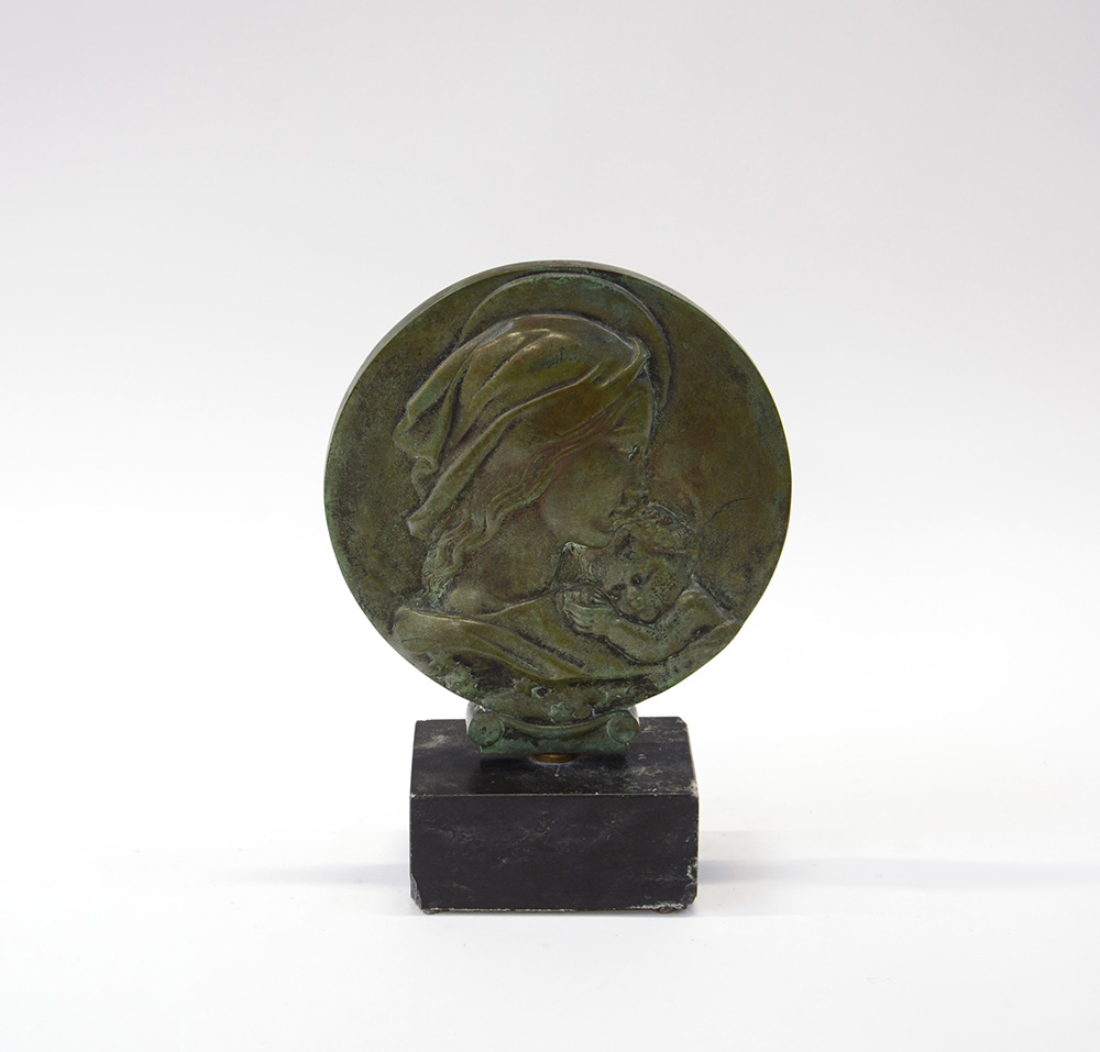 "Ave Maria" medaglione in bronzo patinato su base in marmo, anni '30 sec. XX (h cm 28) (difetti)
