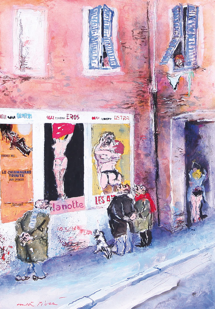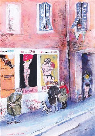 WALTER PIACESI Ascoli Piceno 18/09/1929  Pubblicità in periferia, 1997  tecnica mista su cartoncino cm. 50x35, firma in basso a sinistra, titolo, firma, anno, tecnica, archivio e timbro dello Studio d'Arte Cà Spinello (Fermignano-PU) al retro, dichiarazione d'autenticità dell'artista e archivio dello Studio d'Arte Cà Spinello (Fermignano-PU) su foto.