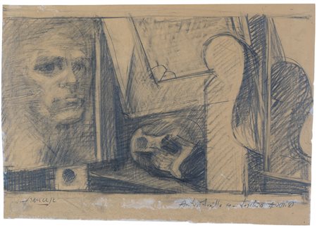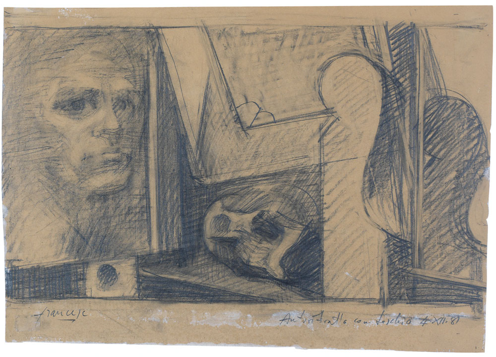 FRANCO FRANCESE Milano 05/10/1920 - Milano 20/09/1996 - Autoritratto con teschio, 1981, matita su carta cm. 30,5x43,5; firma in basso a sinistra, titolo e anno in basso a destra, dichiarazione d'autenticità dell'artista su foto, pubblicato sul catalogo della mostra "Franco Francese, Temi disegni-pastelli-tempere 1962-1992" a cura di Fabrizio D'Amico, tenutasi nell'aprile - maggio 1992 presso la Galleria Bottega D'Arte Repetto & Massucco (Acqui Terme) pagina 78-79.