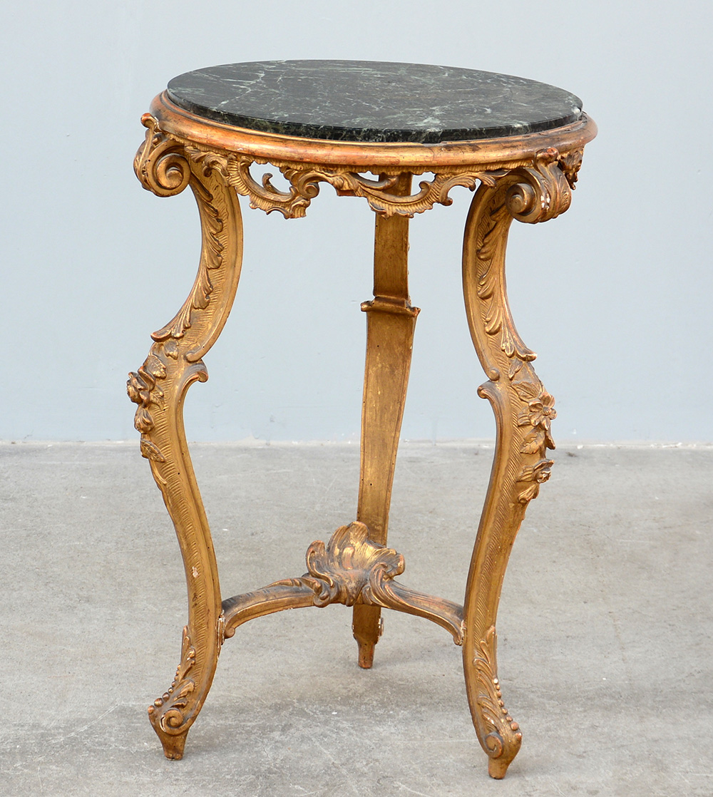 Tavolino tondo tripode in legno intagliato e dorato di gusto rocaille, piano in marmo nero; sec. XIX (cm 51x79x51) (difetti)