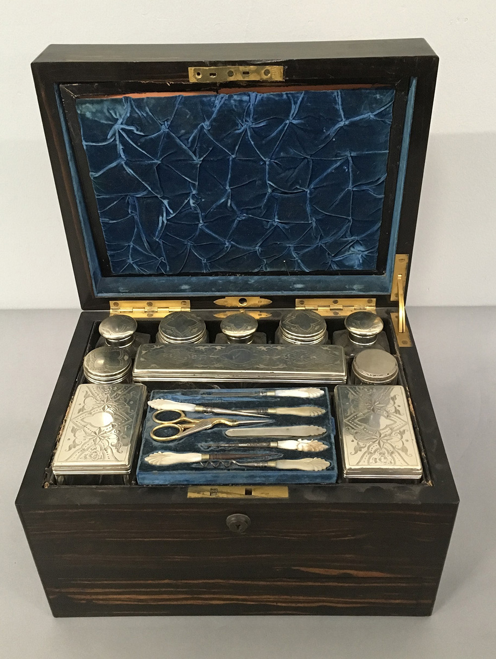 Manifattura inglese, necessaire da toilette con custodia in palissandro, contenente numerose boccette in vetro con tappi in metallo argentato ed altri accessori. Inghilterra, fine sec. XIX, inizio sec. XX (difetti)