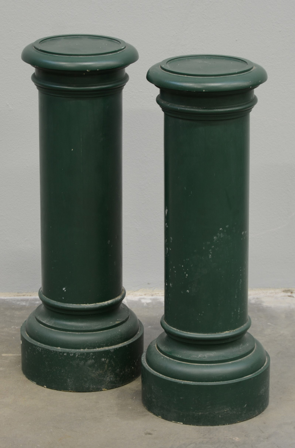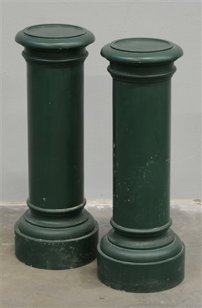 Coppia di colonne tonde porta vasi in legno dolce laccato verde (h cm 72) (difetti)