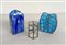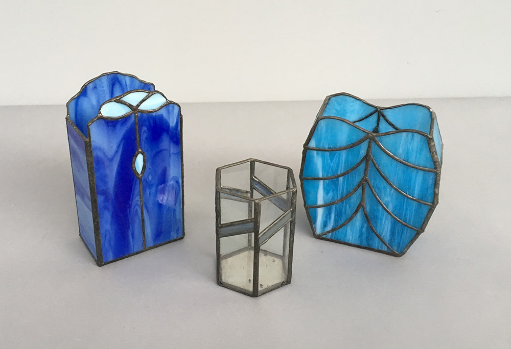 Manifattura inglese, lotto di tre vasi con tessere in pasta vitrea legate a piombo (h max cm 19,5) (difetti)