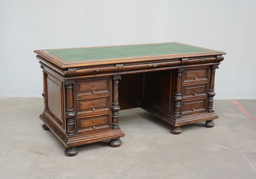 Scrivania da centro a tre cassetti in linea sottopiano e sei laterali....