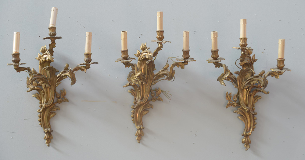 Lotto 3332 | Gruppo di tre aplliques a tre fiamme in bronzo dorato e cesellato a volute...