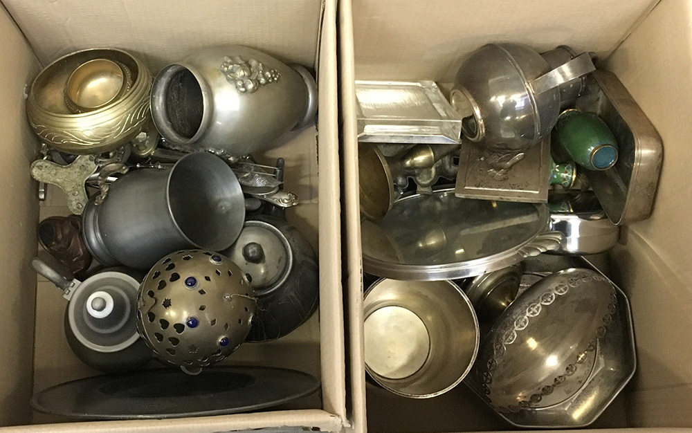 Lotto di due cartoni contenenti numerosi oggetti in metallo per usi differenti (difetti)