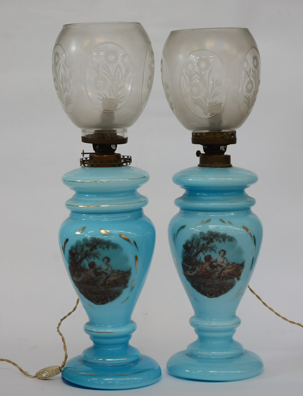 Lotto 3343 | Coppia di lampade da tavolo celeste in opaline decorati con scene galanti,...