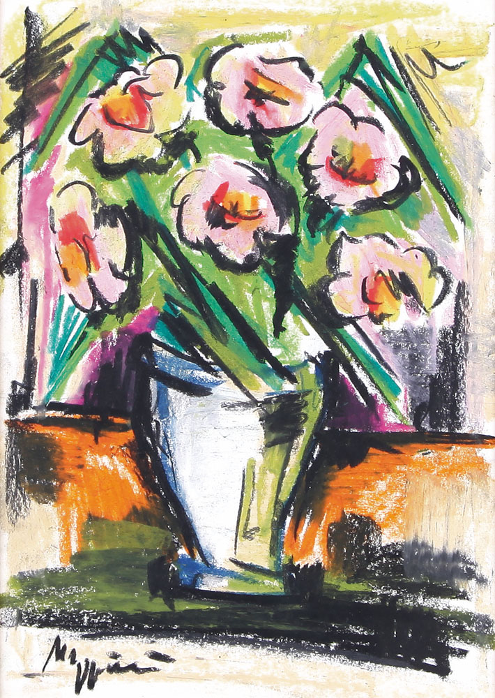 PIERO MAGGIONI Monticello Brianza (Co) 1931 - Vigano' (Co) 1995 Fiori rosa, anni '80 tecnica mista su cartoncino cm. 35x25, firma in basso a sinistra, opera registrata presso l'Archivio Fotografico Generale delle Opere di Piero Maggioni come da dichiarazione del figlio Antonio su foto.