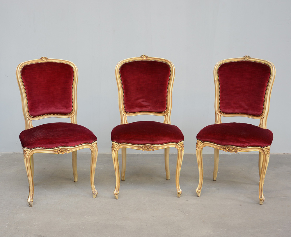 Lotto di tre sedie in legno laccato e parzialmente dorato (difetti)