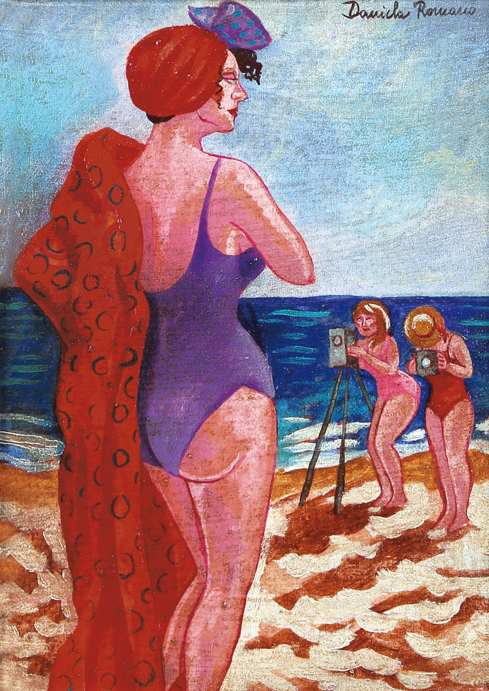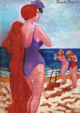 DANIELA ROMANO Napoli 27/11/1947 - Roma 27/06/2009 Bellezze al bagno olio su tela cm. 35x25, firma in alto a destra, titolo e firma al retro, dichiarazione d'autenticità dell'artista su foto.