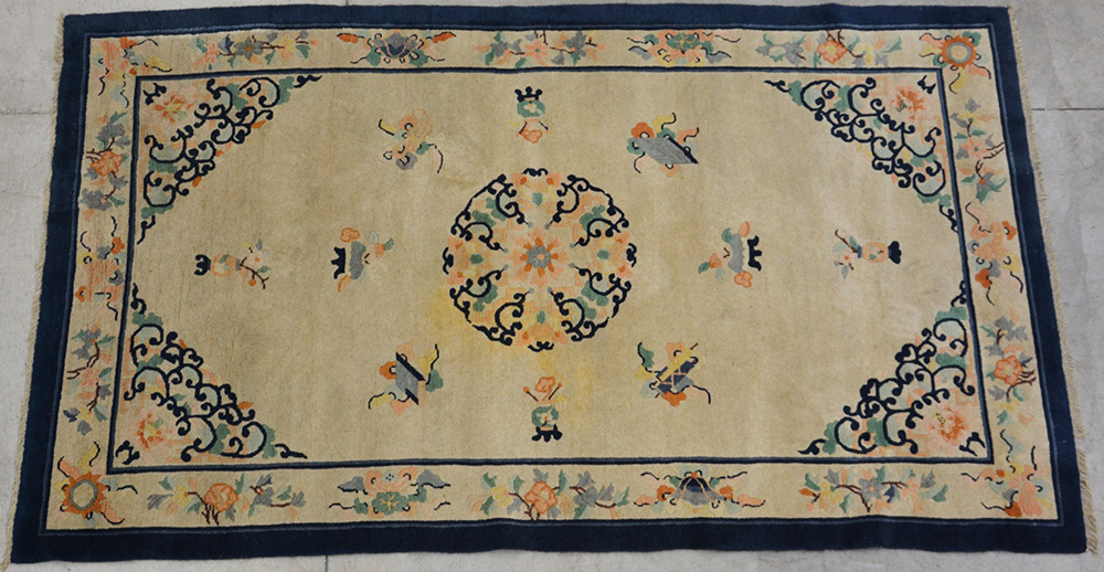 Disegno a fondo centrale floreale policromo su fondo crema cosparso di simboli taoisti. (cm 220x133) (difetti)