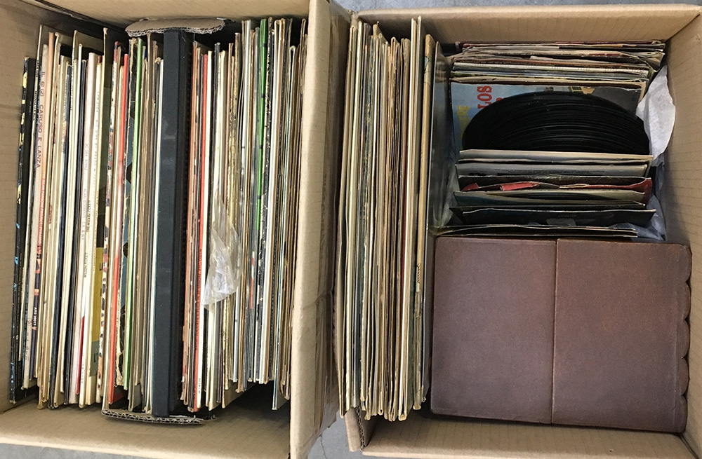 Lotto di due cartoni contenenti numerosi vinili di musica pop (difetti)