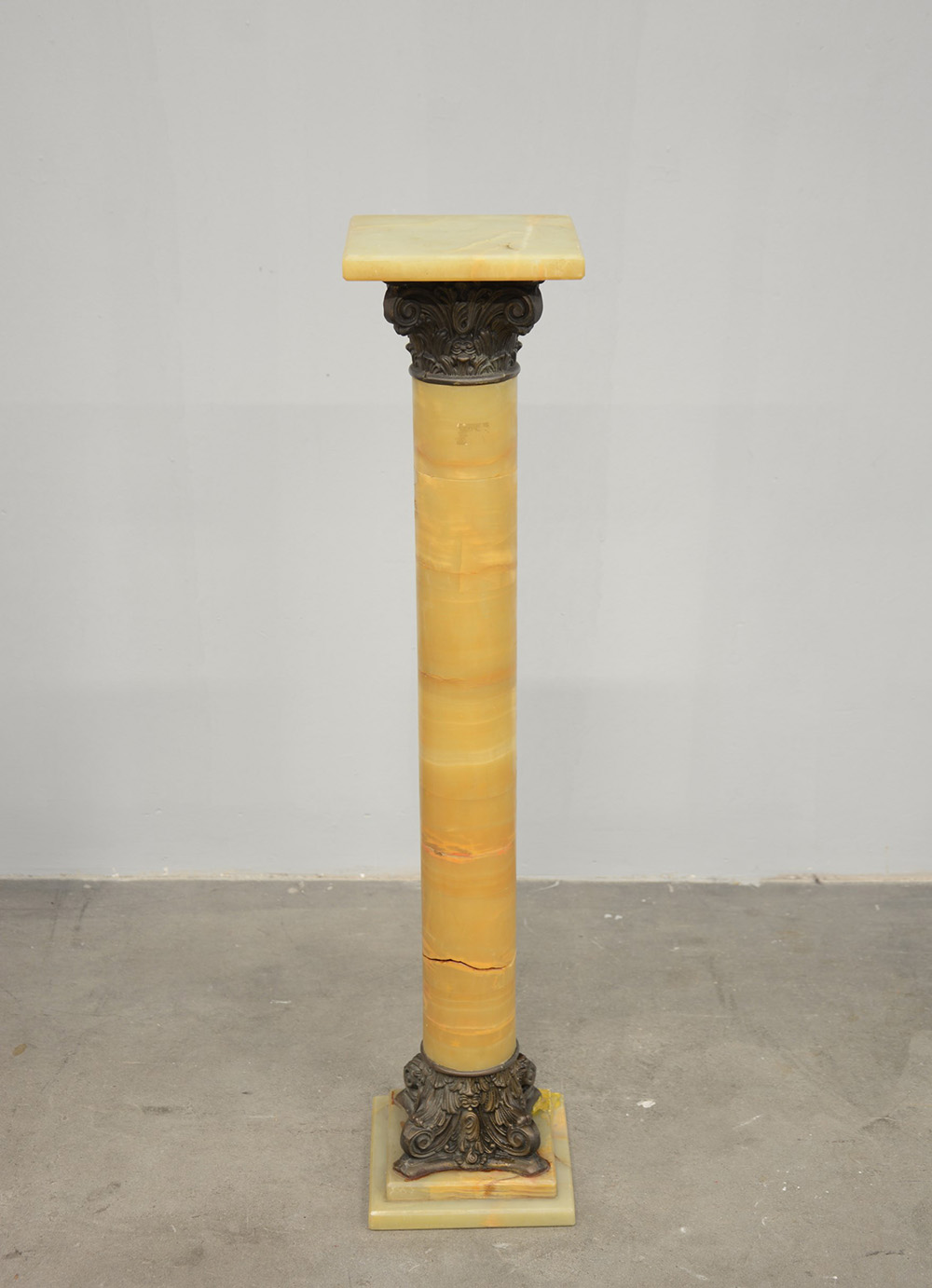 Colonna in alabastro con fusto tornito con base e capitello in legno...