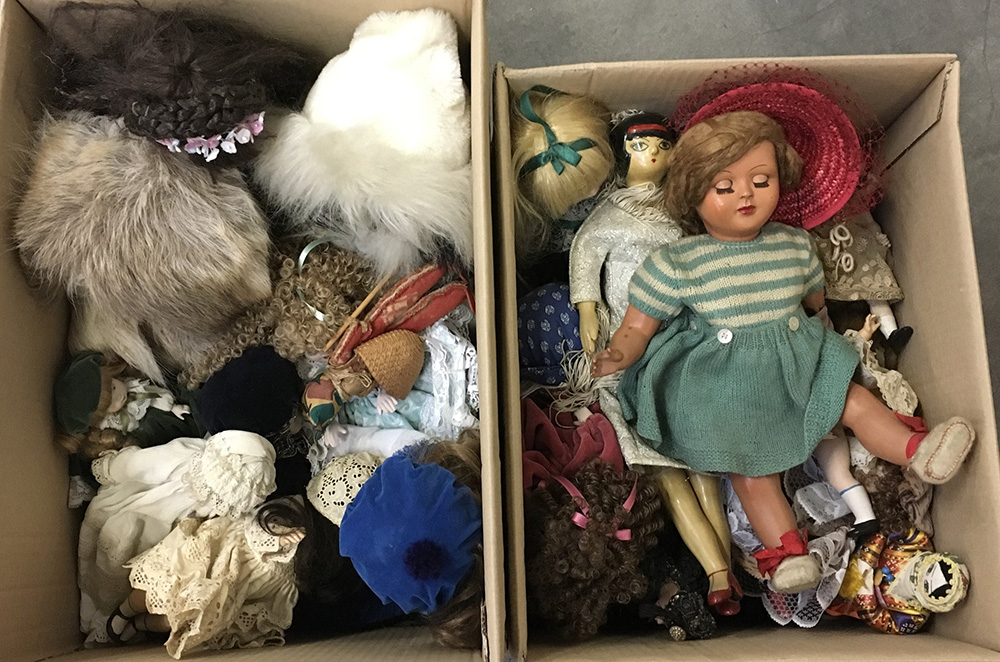 Lotto di due cartoni contenenti numerose bambole da gioco e collezione di fatture ed epoche differenti (difetti e mancanze)