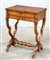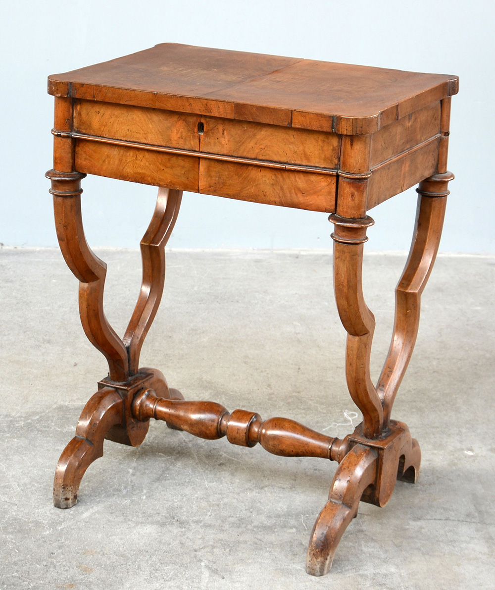 Scrittoio-toilette in noce con piano apribile e cassetto nella fascia celante vani portaoggetti, gambe mosse riunite da traverse; sec. XIX (cm 59x77x43) (difetti)