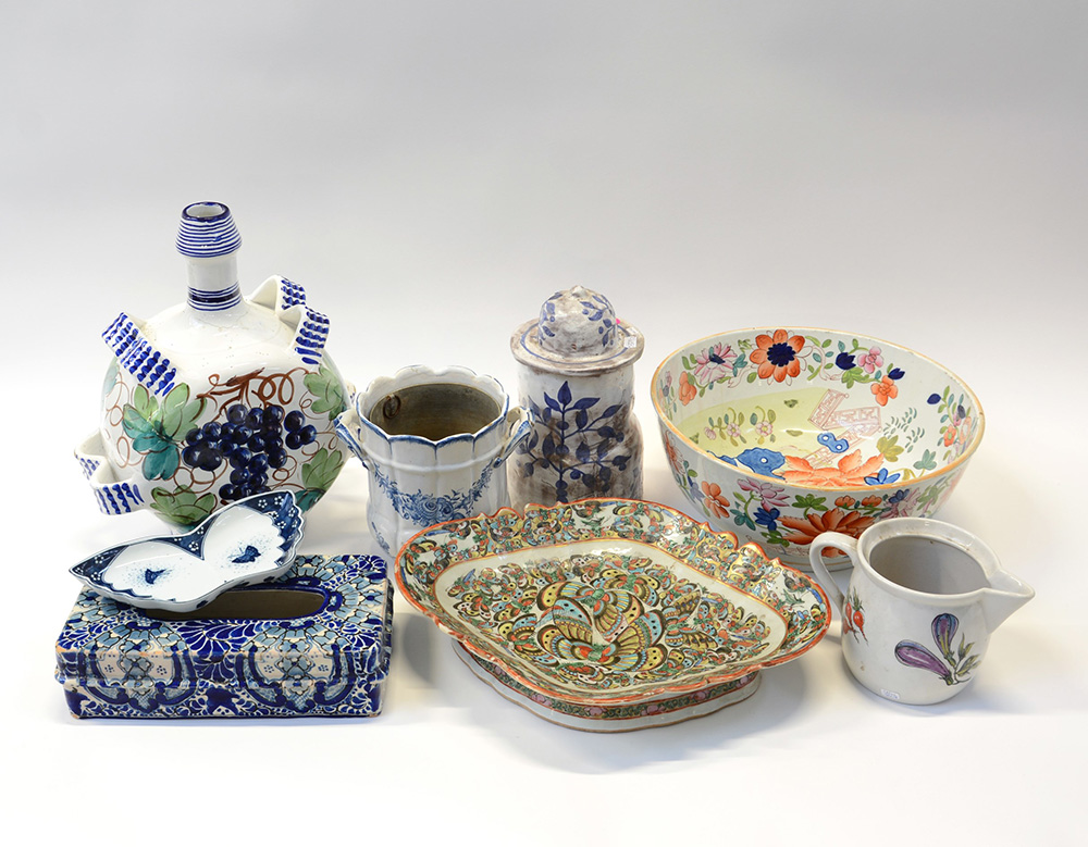 Manifatture diverse, lotto composto da otto oggetti diversi in ceramica e porcellana policroma (difetti e restauri)