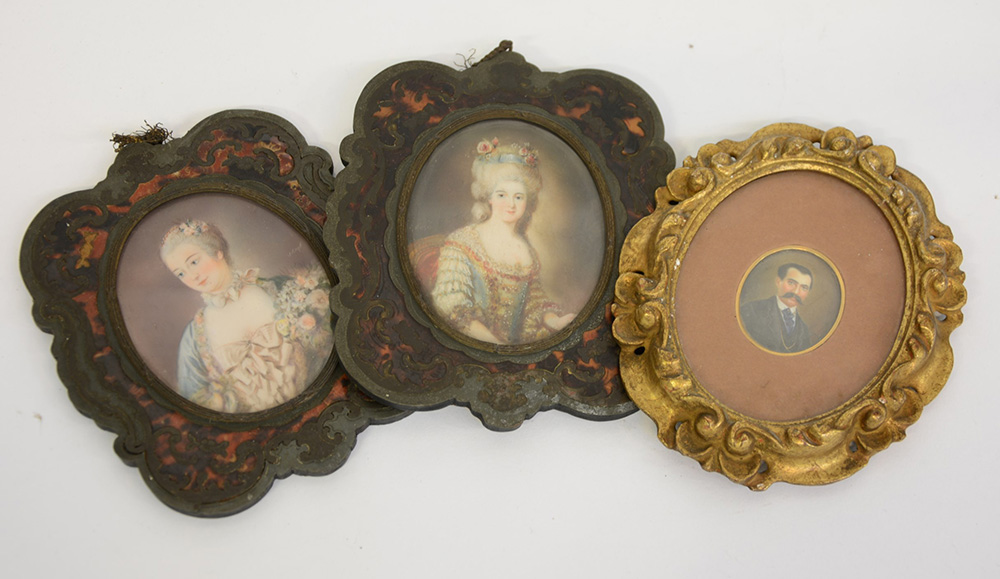 Lotto composto da una coppia di miniature raffiguranti nobildonne e una miniatura raffigurante un personaggio maschile, in cornici (difetti)