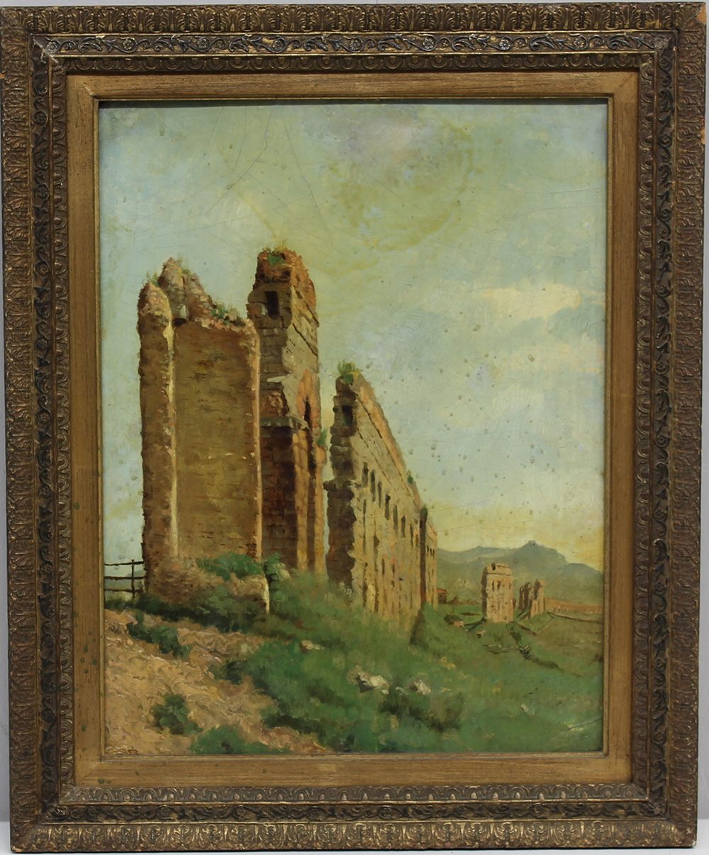 Ignoto "Paesaggio con rovine" olio su cartoncino (cm 35x27) in cornice