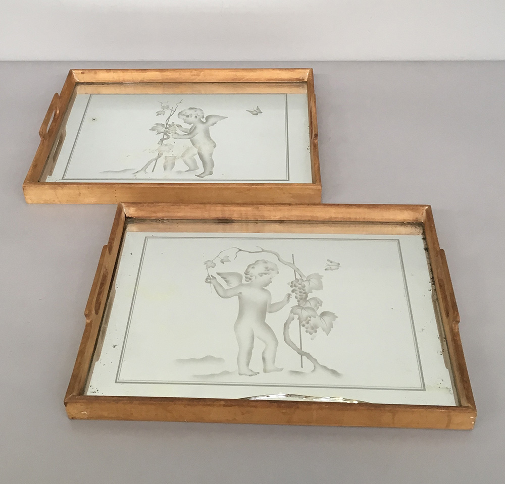 Coppia di vassoi biansati in legno con piano a specchio inciso raffiguranti putti con tralci d’uva (difetti)